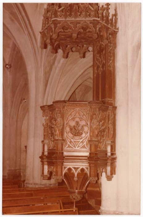 Chaire néo-gothique formée d'une cuve à cinq panneaux sculptés d'arcatures et polylobes abritant des sujets religieux. Les arêtes de la cuve sont marquées par des statues sous des dais. Dorsal et abat-voix orné de gâbles et pinacles.
