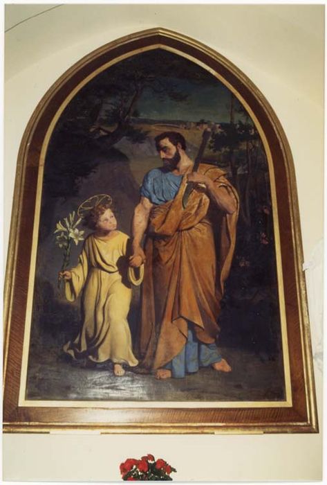 Scène figurée dans un paysage, avec arbres et village dans le lointain (Nazareth ?). Saint Joseph tient sur son épaule gauche un outil de charpentier, sa main droite tient la main de l’Enfant Jésus, son visage est tourné vers celui-ci. Il est vêtu d’une longue tunique bleue, recouverte d’un manteau ocre. L’Enfant marche à ses côtés, le visage levé dans sa direction, tenant des fleurs de lys dans sa main droite. Il est vêtu d’une tunique jaune.