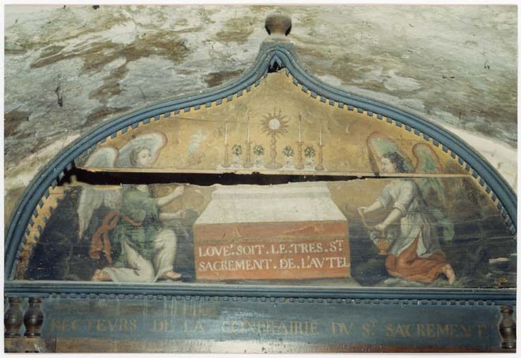 Meuble à deux vantaux sculptés chacun de deux panneaux rectangulaires. Aux angles, doubles colonnettes tournées. Un tiroir à la partie inférieure. Posé sur deux pieds en console. Fronton en arc en accolade, orné d’une scène peinte : deux anges agenouillés encensent un autel au centre sur lequel sont présentés un ostensoir encadré de quatre bougeoirs et quatre pots de fleurs. Le devant de la table porte une inscription. Un panneau de bois mouluré du 18e siècle le rattache au mur nord de la sacristie.