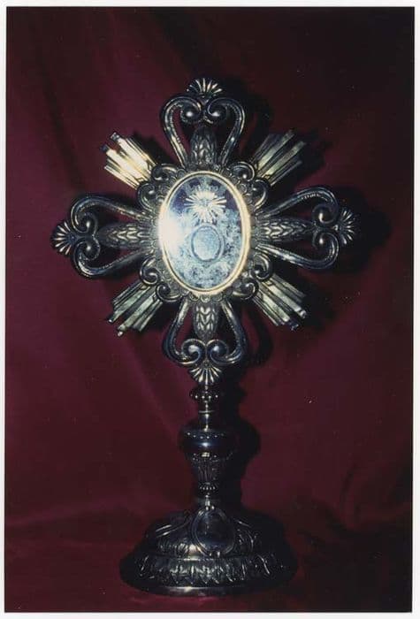Monstrance ovale entourée de rayons alternés avec des palmettes ajourées. Tige en balustre. Pied circulaire bombé au décor ciselé de médaillons contenant une représentation des armoiries de saint Etienne, des évangiles, des tables de la Loi, de la croix, feuilles en bordure. La monstrance renferme des reliques contenues dans un petit médaillon ovale, entouré de branches en papier argenté découpé et surmonté d’une colombe sous une couronne.