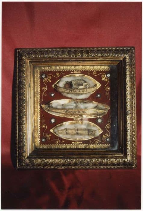 Reliques de saint Urbain et sainte Béatrice, et d’un autre saint, entourées de papiers enroulés dorés et perles de verre blanc, sur fond de velours rouge. Bordure de papier doré. Cadre en bois doré, orné de palmettes.