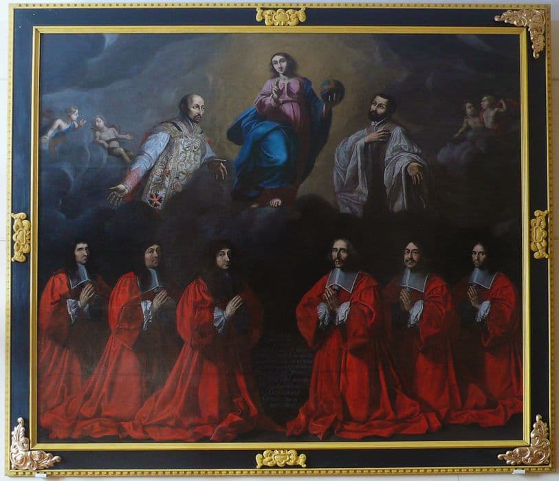 Vierge : bénédiction, globe ; saint Ignace, saint François : médiation ; portrait collectif (notable, en donateur) ; ornementation (angelot)