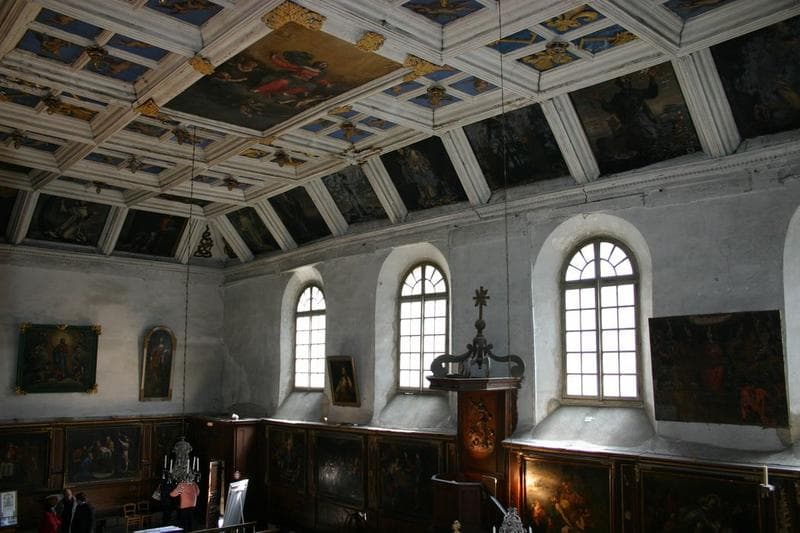Plafond à caissons ornés d'angelots se détachant sur un fond bleu.