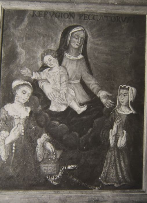 La Vierge est au centre assise sur des nuages, elle tient l'enfant avec le bras droit. Elle tend la main gauche en direction de sainte Pélagie qui est agenouillée les mains jointes. A la droite de la Vierge, à ses pieds, Marie-l'Egyptienne, richement vêtue, se débarasse de ses colliers, au-dessus de sa tête l'enfant Jésus semble tendre les mains dans un geste de bénédiction.