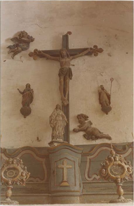 autel (maître-autel), petit meuble, prie-Dieu, banquette de célébrant, deux reliquaires-monstrances, une statue : Christ en croix, deux statues (statuettes) : Saint Amand et Saint Sauveur, et deux haut-reliefs : Anges