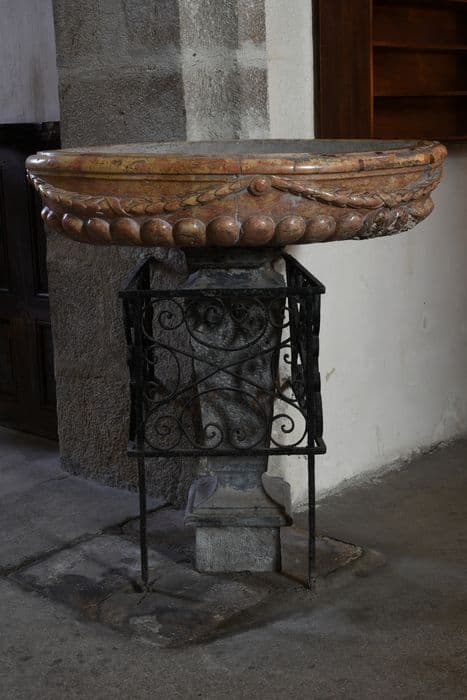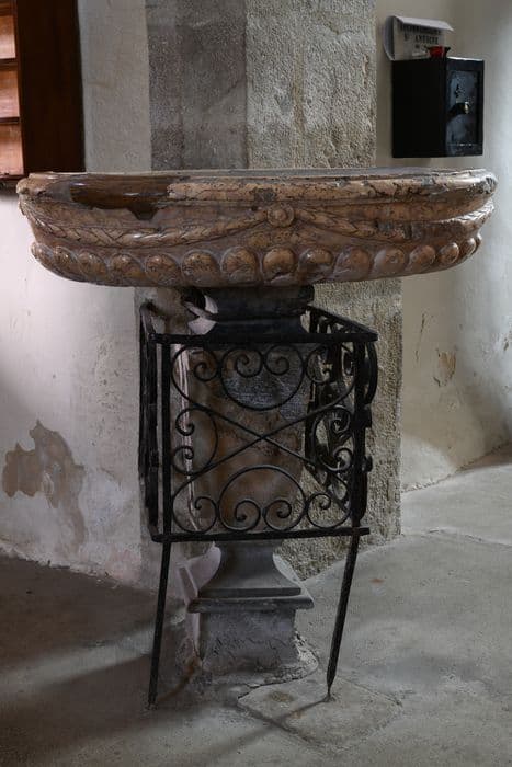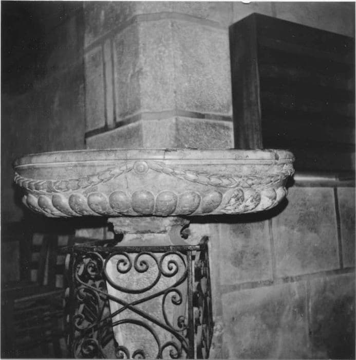La cuve du bénitier est sculptée de godrons et d'une guirlande.