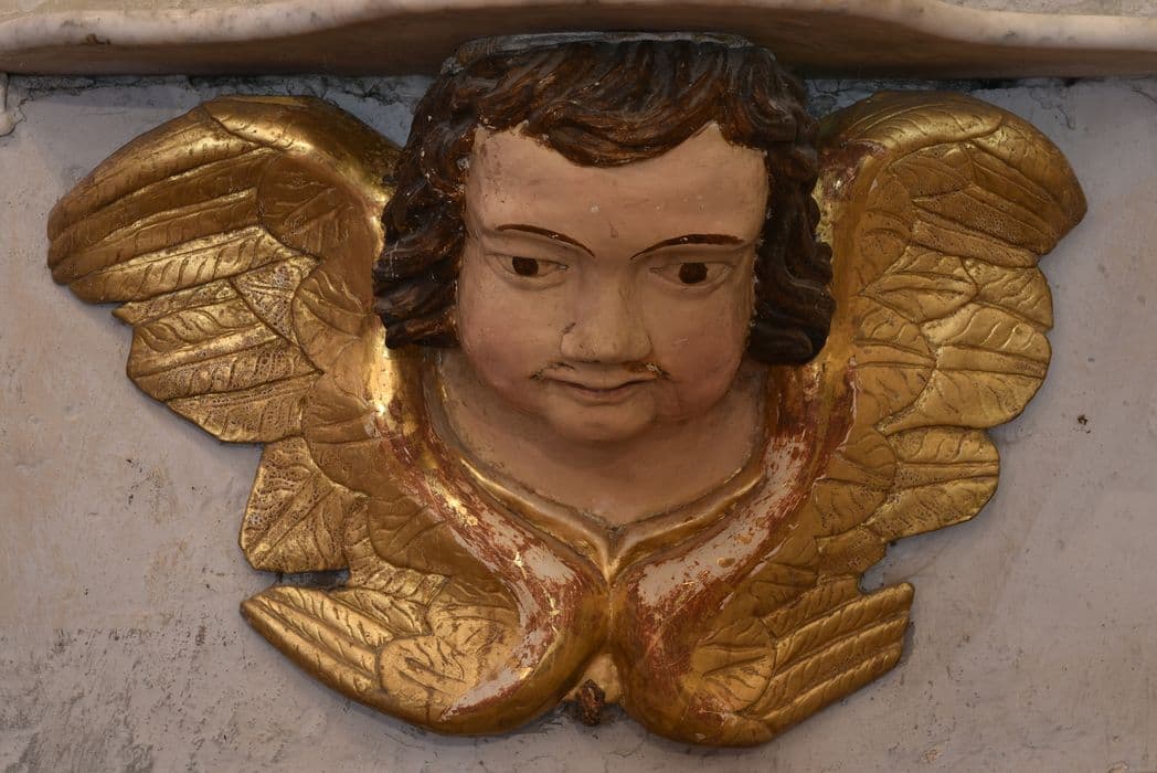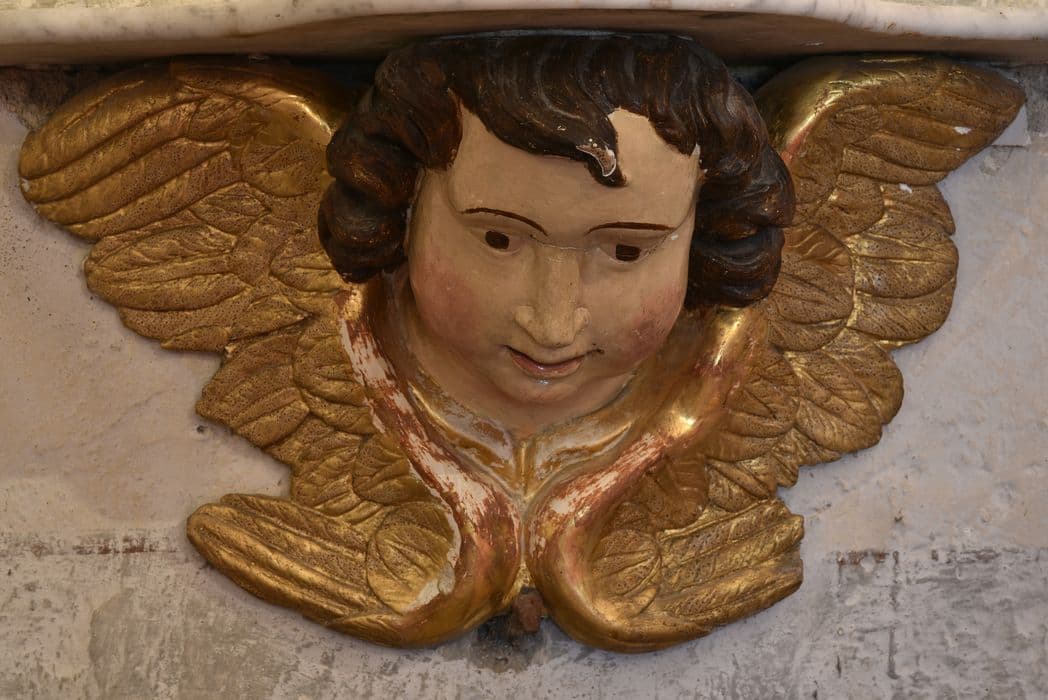 Deux consoles à dessus en marbre blanc, avec têtes d'angelots en bois doré et polychrome.