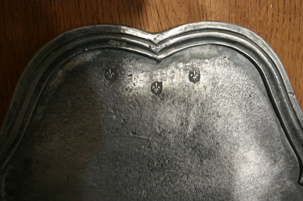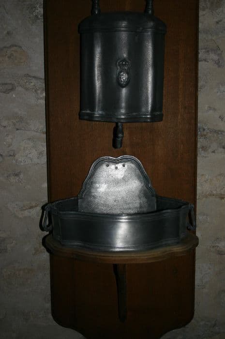 Fontaine-lavabo en étain avec cuve à deux anses et dossier.