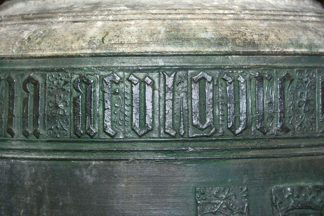 Inscription latine sur trois lignes en minuscules gothiques sur fond orné, invoquant la protection de Saint Amant contre la foudre, le gel et la tempête. Entre les lignes : quatre cartouches gothiques de grand format : une Crucifixion et un blason aux fleurs de lys ; de l’autre côté une Sainte Barbe et une autre sainte martyre. Plus bas sur la robe un cartouche isolé représente une Vierge de Pitié.
