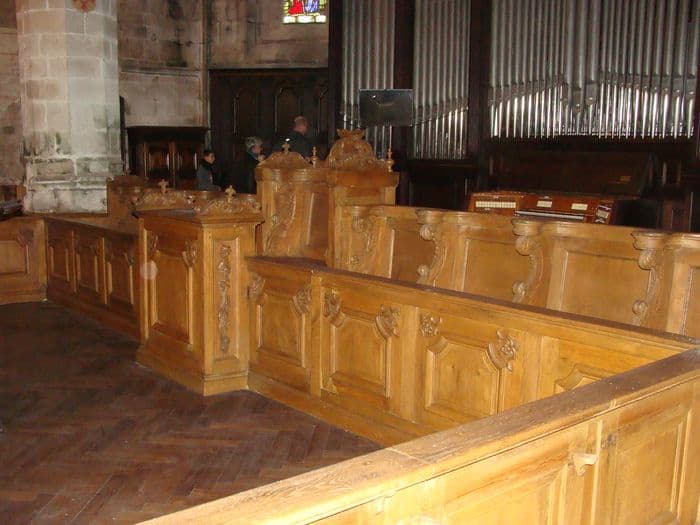 Les panneaux supérieurs coupés à mi-hauteur forment maintenant lambris du collatéral du choeur. Stalles restaurées en 1988 par Christian Karoutzos (Arts et Bâtiment).
