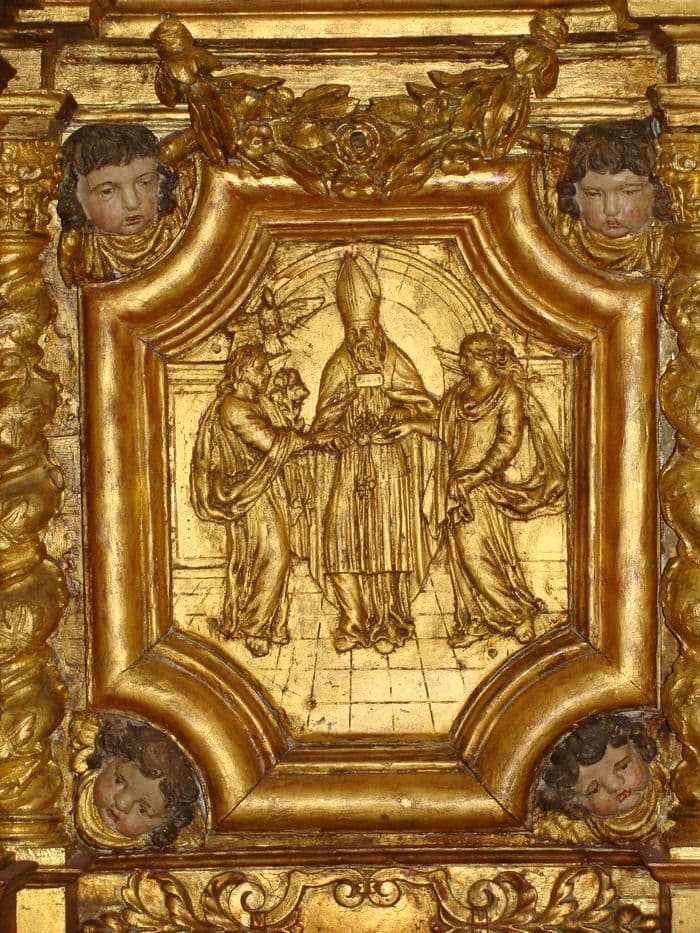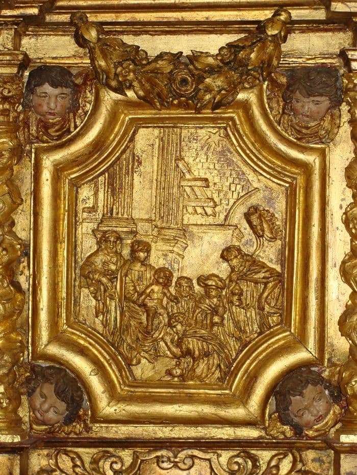 4 bas-reliefs : le Mariage de la Vierge, l'Annonciation, l'Adoration des bergers, l'Adoration des Mages