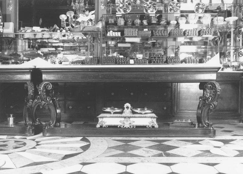 acajou ; verre ; marbre ; bronze ; toile (support) : peinture à l'huile