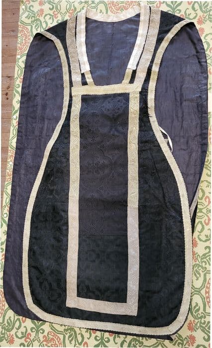Chasuble en damas noir à l'orfroi broché de soie blanche et lamé d'argent.