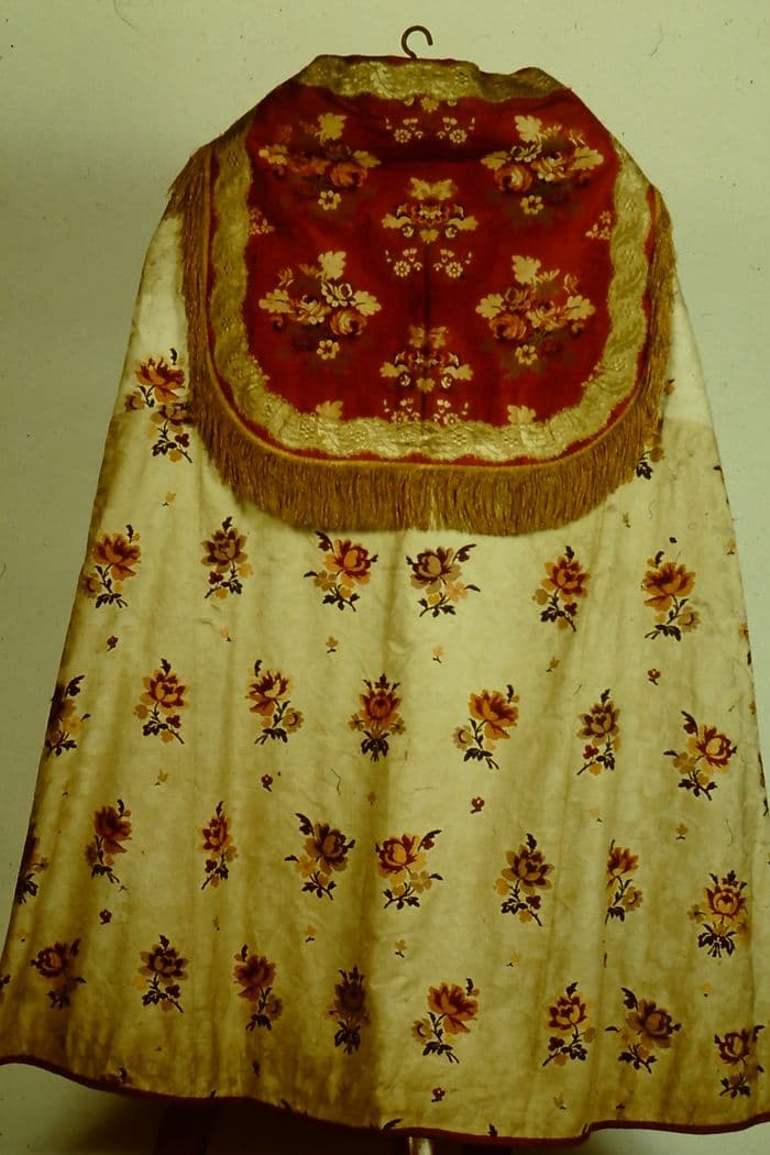Chape en damas blanc et rouge brochés de fleurs polychromes.