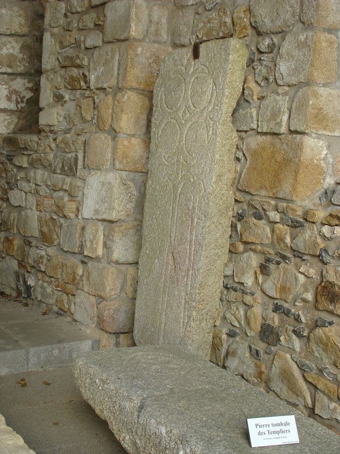 Pierre tombale en granit sculpté d'une croix ancrée et d'une épée.