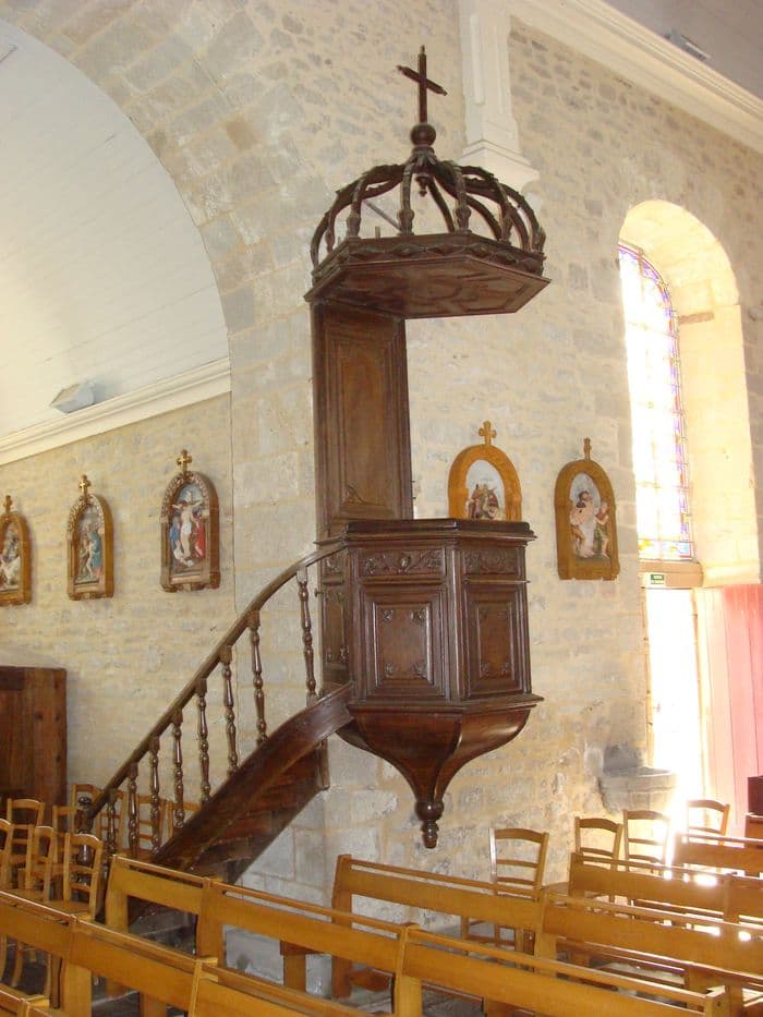 Chaire adossée ; escalier droit latéral gauche, à balustres ; cuve à culot en talon droit ; abat-voix à couronnement en réseau, en talon renversé ; amortissement : globe et croix.