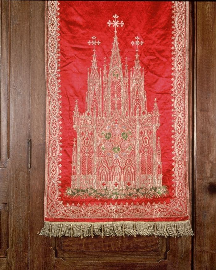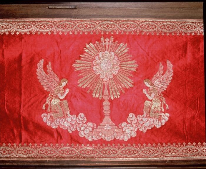 Voile en soie rouge brochée à fil d'or et d'argent.