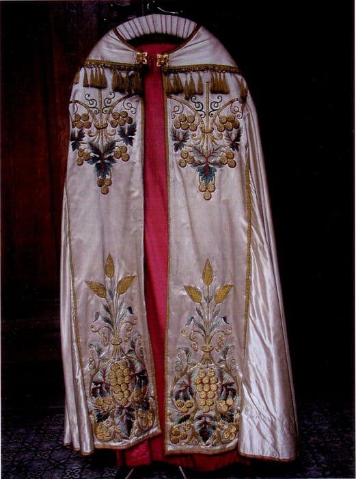 Chape blanche : satin brodé d'or, soies polychromes à motifs, dont motifs de blés et de vignes, un pélican sur le chaperon.