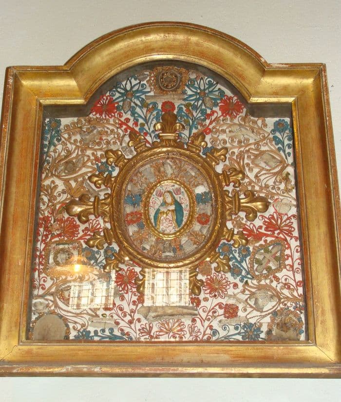 Tableau-reliquaire en pâte de reliques, papiers roulés et colorés dits paperoles, cire et bois doré.