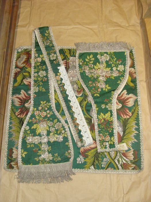 Ornement vert constitué d'une chasuble, d'une étole, d'un voile et d'une bourse de corporal.