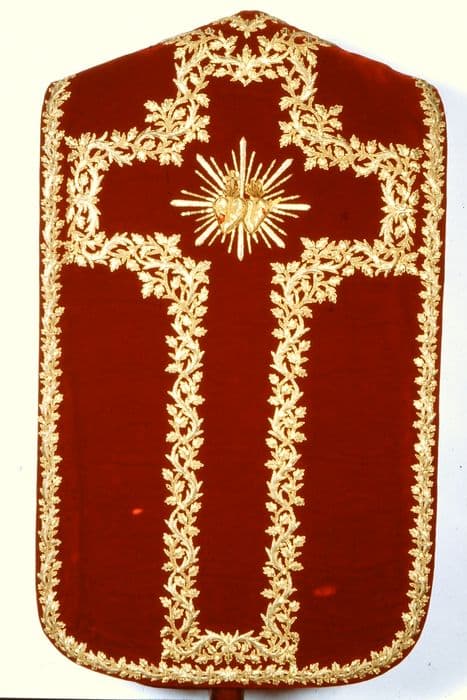 Ornement rouge composé d'une chasuble, d'une étole, d'un manipule et d'une bourse du corporal.