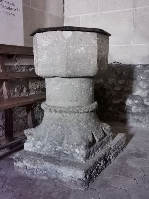 C'est une vasque octogonale très simple, supportée par un chapiteau renversé provenant certainement de l'abbaye voisine.