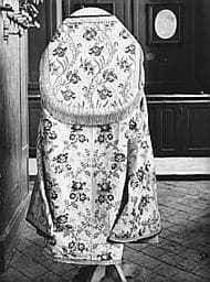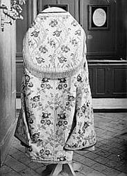 Ornements sacerdotaux en soie brochée sur fond blanc.