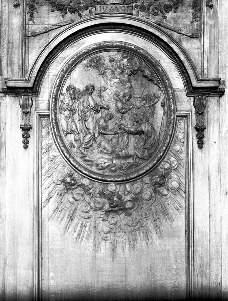 Ces hauts dossiers des stalles murales comprenent 22 panneaux avec médaillon représentant des scènes de la vie du Christ, séparés par des compartiments avec armes royales, emblèmes et trophées religieux.
