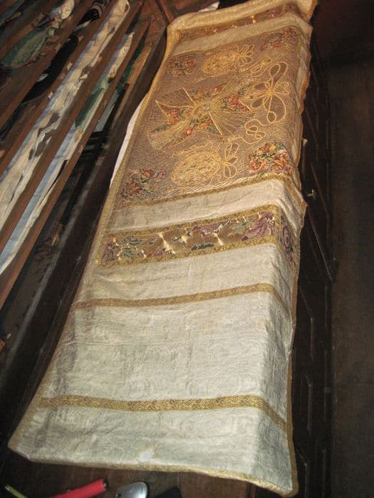 Au milieu est une croix de Malte, entourée de broderies représentant la Vierge, brodée en or et argent sur fond azur, au-dessus de laquelle est un coeur d'or suspendu à une cordelière, de chaque côté, des médaillons brodés en or sur fond argent, accompagnés d'une cordelière : celui de droite porte les le ttres S.P.E (Saint Pierre Ensentelée), celui de gauche les le ttres S.M. (Sainte Marie).