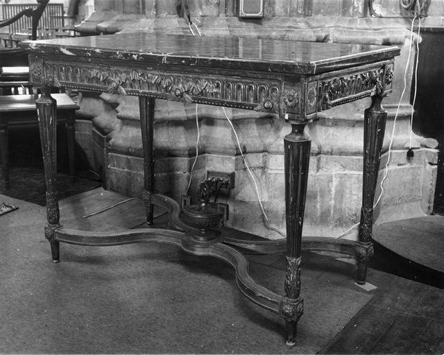 Les parties des guirlandes dépassant la ceinture manquent. Les pots à feu ont été volés le 3 mars 1979 et refaits en 1981.
