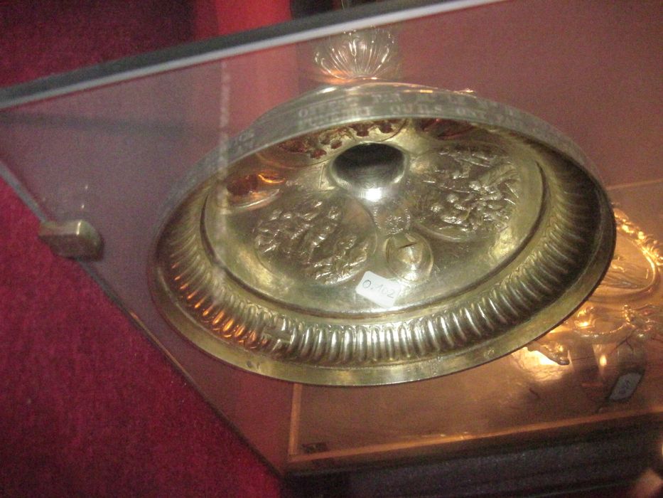 Fait partie de la chapelle d'évêque qui comprend le plateau et les burettes classés sous le n°51 du Trésor, offerte au Chapitre pour le remercier du service funèbre de sa mère.