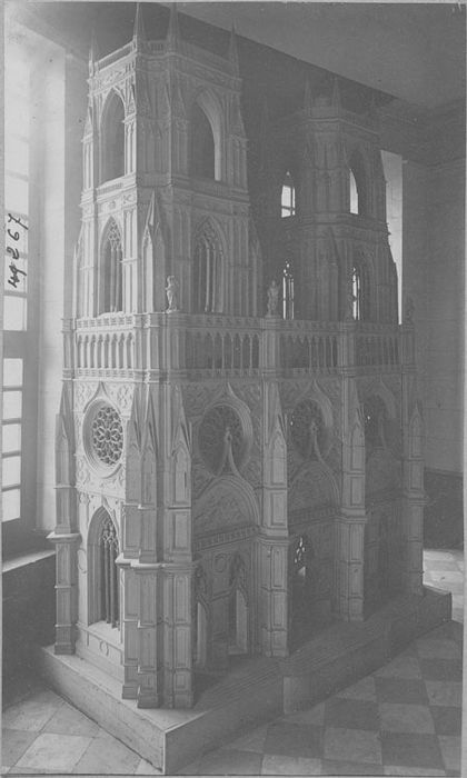 Modèle des tours de la cathédrale d'Orléans exécuté dans l'orangerie du palais de Versailles de 1737 à 1740 d'après les plans de J. Gabriel premier architecte du roi. La menuiserie fût faite par l'échaudé menuisier du roi. Les huit statuettes en terre cuite et les bas-reliefs sur bois des trois portraits furent exécutés par Rousseau sculpteur du roi. Quatre statuettes ont disparu. Cette maquette fut installé dans le grand escalier du château de Versailles pour être présentée au roi puis transportée dans la cathédrale d'Orléans pour servir de modèle aux constructeurs.