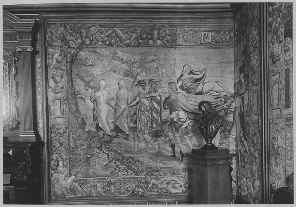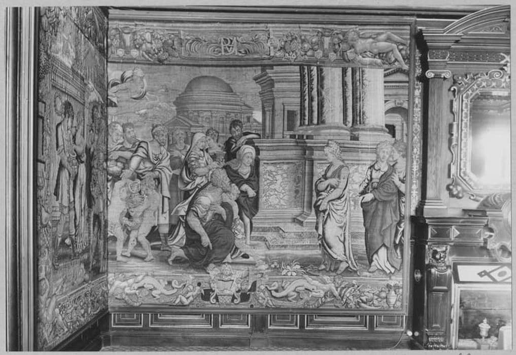 h = 275 ; la = 178 ; Dimensions de la 1ère tapisserie ; 2e tapisserie : h = 275, la = 400 x 159 ; 3e tapisserie : h = 275, la = 372 ; 4e tapisserie : h = 317, la = 304