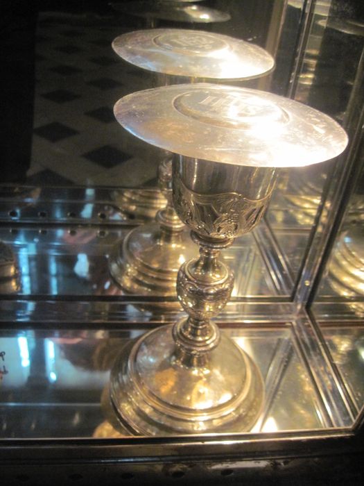 De style Louis XV, à fausse coupe découpée et repercée, dépourvu de décor sur le pied, orné d'entrelacs sur les anneaux et le noeud, de cannelures sur le noeud, de pampres, d'épis de blé et de coquilles sur la fausse coupe.