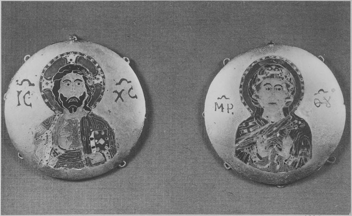 Deux boucles de ceinture en bronze, anneau de bronze avec pierre non identifiée, vestiges de vêtements liturgiques, noeud de calice en étain, médaillons de gants consistant en disques d'or décorés d'émaux cloisonnés art Byzantin 11e siècle, plaque de plomb avec inscription donnant le nom de l'évêque et la date de son décès.