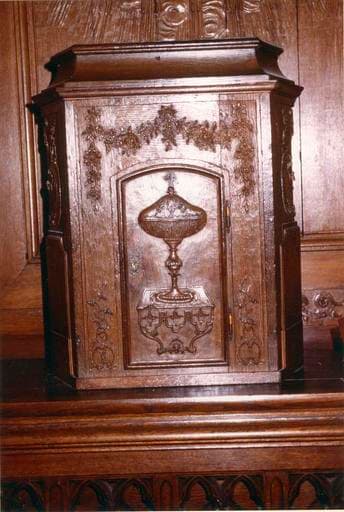Tabernacle en chapeau de gendarme, à façade curviligne, orné de feuilles d'acanthe et de cartouches. La porte présente le symbole de la Trinité.