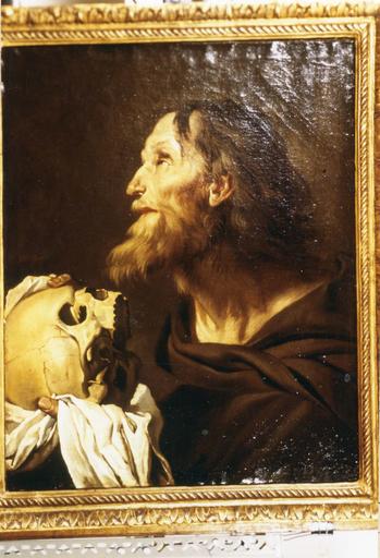 Iconographie peu courante : saint François Borgia, troisième général des Jésuites, tenant entre ses mains le crâne de la reine Isabelle dont la vue détermina sa vocation religieuse. Portrait du saint en buste.