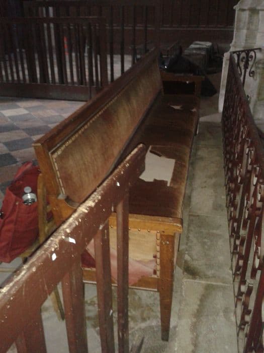 Banc de menuiserie couvert de velours rouge lacéré.
