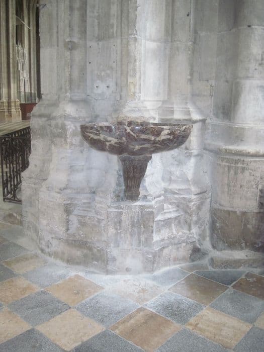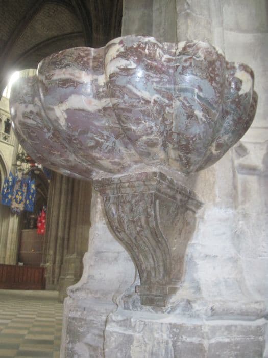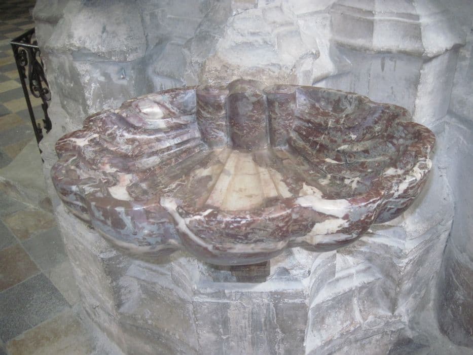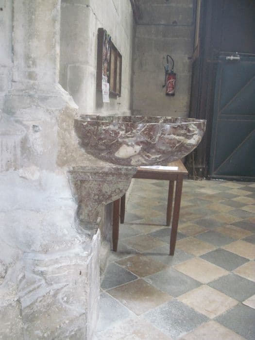Bénitier en forme de coquille sur console en marbre rouge, fixé au mur par de la maçonnerie. Présence de plusieurs crochets et trous de fixation au-dessous.