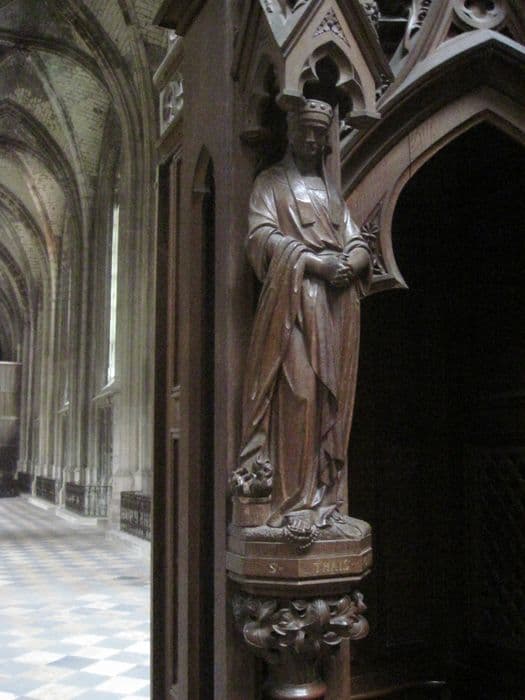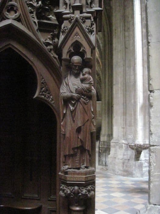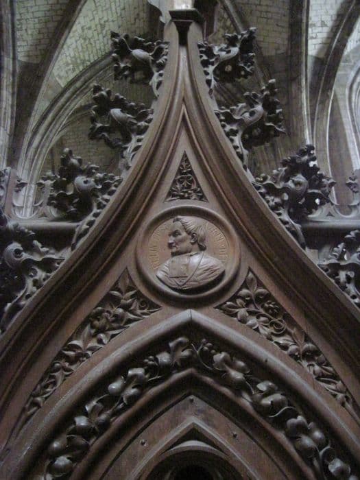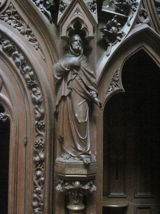 Confessionnal de style néo-gothique en chêne massif avec traces de polychromie, à deux places. Il ouvre par des portes libres en arc brisé, couronnées par des gâbles garnis de crochets et amortis d'une statuette d'ange sur les côtés, et de saint Georges au centre. La porte centrale présente un vantail richement sculpté, orné d'une croix et ajouré d'un réseau dans la partie supérieure. Dans le gâble, médaillon à l'effigie de Mgr Dupanloup. Les pilastres accostant les portes sont agrémentés d'une colonnette supportant des statuettes de saints.