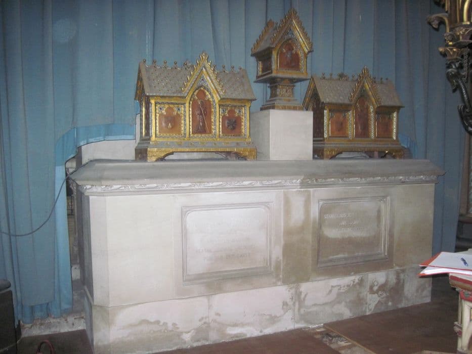 Dans le choeur de la cathédrale, chapelle Sainte-Thérèse-de-l'Enfant-Jésus, dite aussi des Fonts (chapelle 3 du plan Chenesseau). Posées côte à côte sur les gradins du revers de l'hôtel du cardinal Touchet.