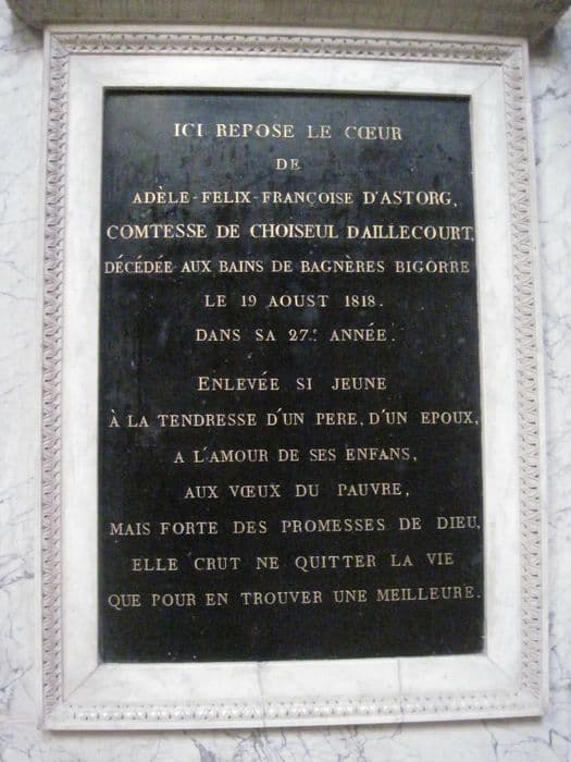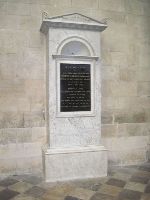 Monument funéraire en borne, de style néo-romain, en marbre blanc veiné, accolé au mur. Il est orné d'une table inscrite bordée de rais de coeur, surmontée d'une niche hémicycle et couronnée de feuilles de lierre sous un fronton triangulaire bordé de deux demi palmettes.