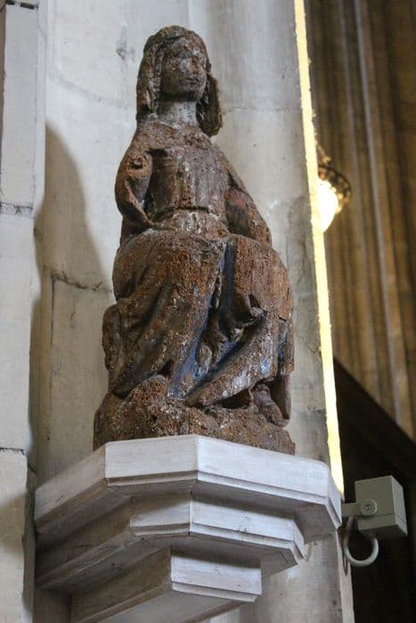 A la croisée du transept de la cathédrale, pile sud-est. Présentée à son retour de restauration sur un socle fabriqué à cette fin fixé à la pile.