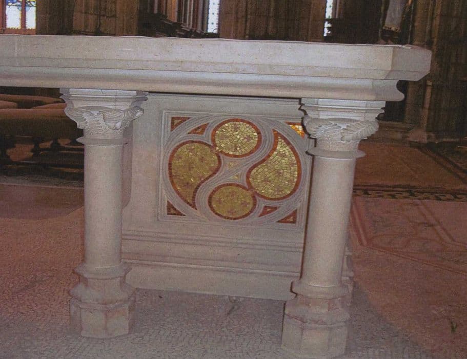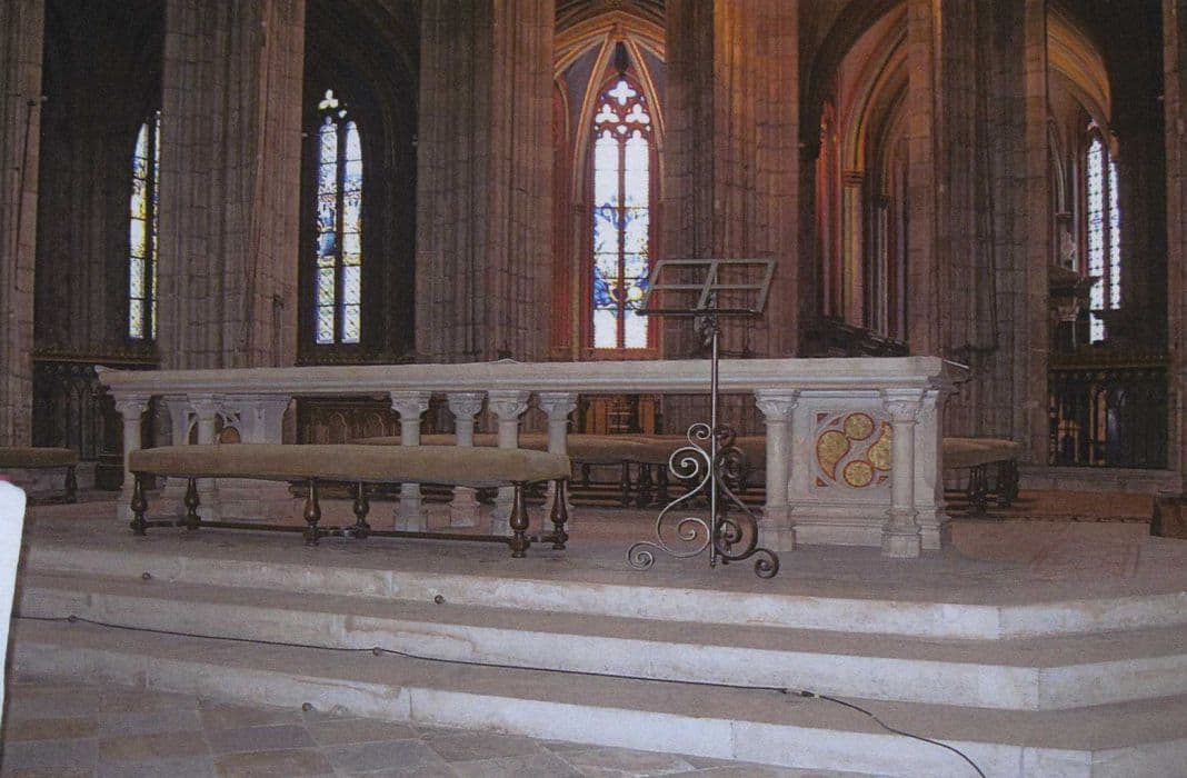 Maître-autel reposant sur deux massifs aux extrémités et sur huit colonnettes de style néogothique, à bases prismatiques et chapiteau feuillagé. Il est orné sur les massifs de médaillons creusés de mouchettes, dont le fond est décoré en façade d'une mosaïque rouge et or à semis de croix de Malte. La plate-forme et l'emmarchement sont ornés d'une mosaïque gris blanc à semis de fleur de lys, cernée d'une bordure de style néogothique à motifs géométriques et rosiers fleuris.