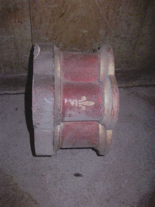 Petit support bobine sculpté en bois peint à motif de fleurs de lys dorées sur fond rouge.
