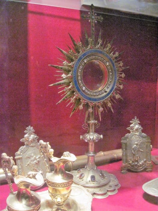 Dans la sacristie de la cathédrale, rez-de-chaussée, 2e salle, Trésor. Virtine blindée située derrière les portes de lambris marquées 2 et 3, côté nord. Posée sur une tablette inférieure à l'intérieur de la vitrine.