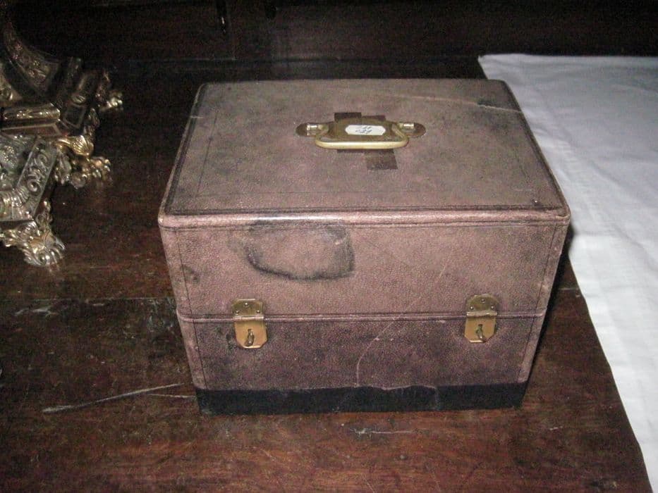 Argent doré et émaillé, verre. Calice et patène de style néogothique dans leur boîte. Calice (0.28) à noeud plat et collerette découpée et repercée sous la coupe, orné sur le pied de médaillons à sujets émaillés : Vierge à l'Enfant, Crucifixion, quatre évangélistes (lion, aigle, taureau, ange) ; de rinceaux sur le pied, la tige et la collerette, et sur le noeud de losanges à sujets émaillés : agneau pascal, pélican, cerf s'abreuvant . Cabochons de verre de couleur sur le pied et sur la tige. Patène ornée d'un médaillon de fleurs ponctué de cabochons en verre coloré, entourant une croix environnée de rinceaux et frappée d'un médaillon à sujet émaillé figurant le Christ chez Emmaüs.
