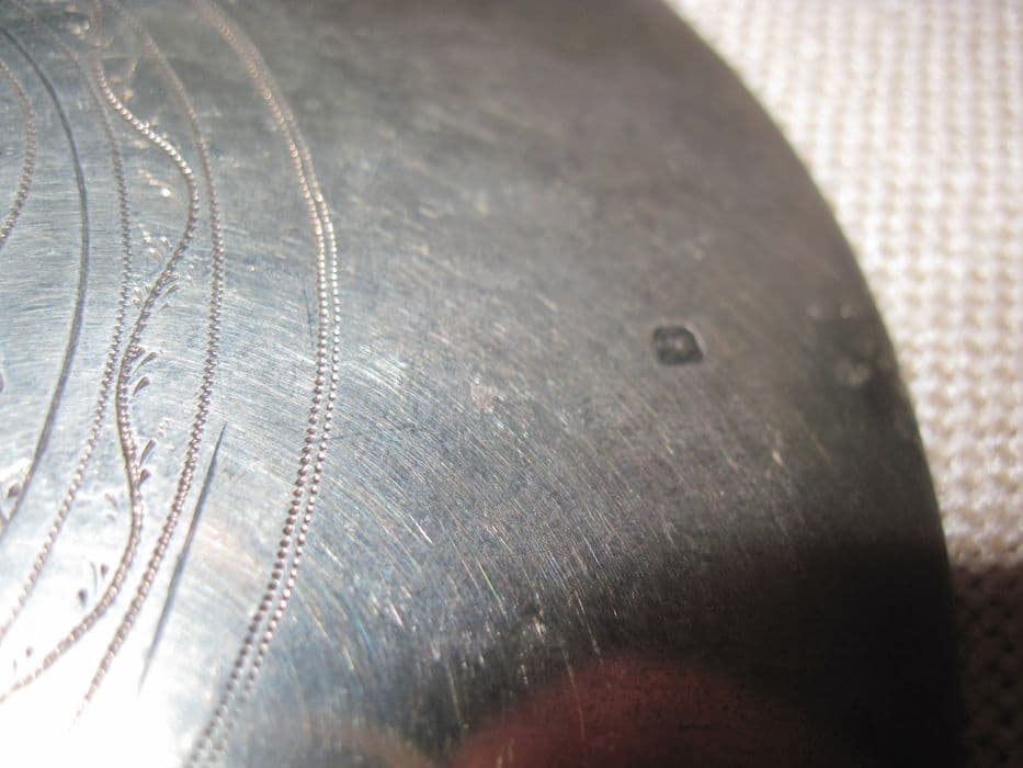 Patène de style néogothique ornée au revers d'un motif ciselé de croix pattée au pied en volutes inscrite dans un quadrilobe ; sur le pourtour de la cuvette au revers, motifs de fleurettes, de vagues et de cercles concentriques en pointillés.