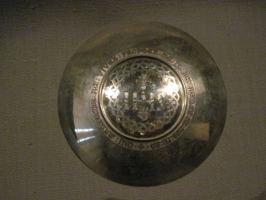 Patène ornée des lettres I.H.S. surmontées d'une croix feuillagée rayonnante ; au-dessous, un coeur surmonté de trois flammes ; sur le pourtour de la cuvette, la couronne d'épines stylisée.