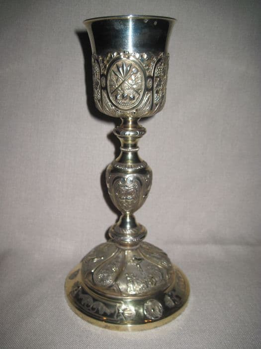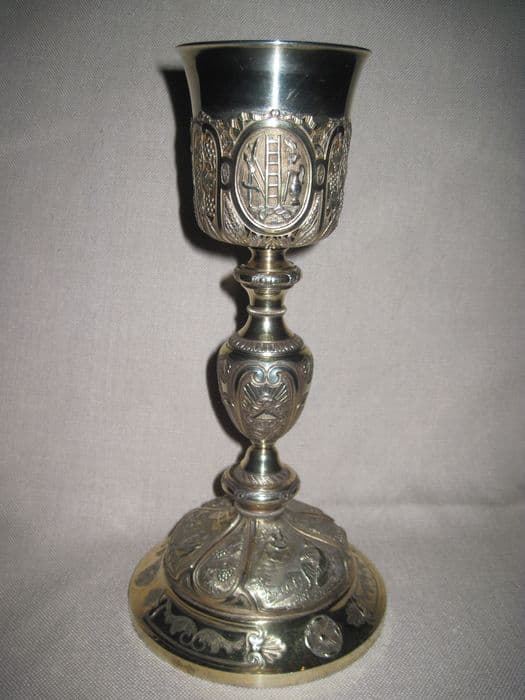 Calice à fausse coupe découpée et repercée, orné sur le pied de la Nativité, ; du Christ au Mont des Oliviers et de la Crucifixion séparés par des pampres, épis de blé et roseaux. Sur le pied, le Sacré Coeur, la Trinité et les tables de la Loi. Sur la fausse coupe, les instruments de la Passion dans des médaillons séparés par des pampres, épis de blé et roseaux.